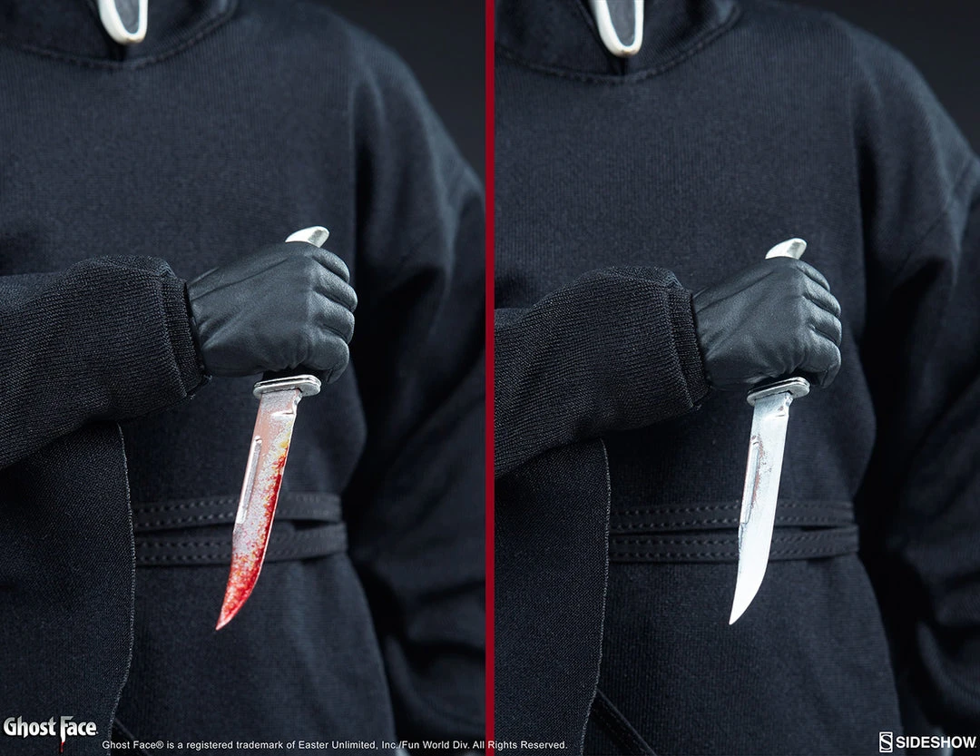 The Ghost Face Sixth Scale Figure has an articulated body beneath the robes, allowing you to craft a number of killer poses with the included array of accessories. The figure includes seven different hands, including one pair of grip hands, one pair of fists, one pair of open hands, and one gesturing left hand. Ghost Face also comes with one clean knife and one bloodied knife accessory, giving you additional display options as this terrifying horror collectible stalks your shelf.