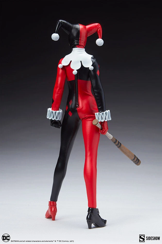 Inspired by her classic comic book appearance, the Harley Quinn Sixth Scale Figure wears a fabric bodysuit costume with black and red paneling, diamond patterns, and sculpted white accents like her collar and wrist cuffs. Harley’s grinning portrait features her signature pale complexion beneath a black domino mask and her trademark two-toned jester hood completing her crazed expression.