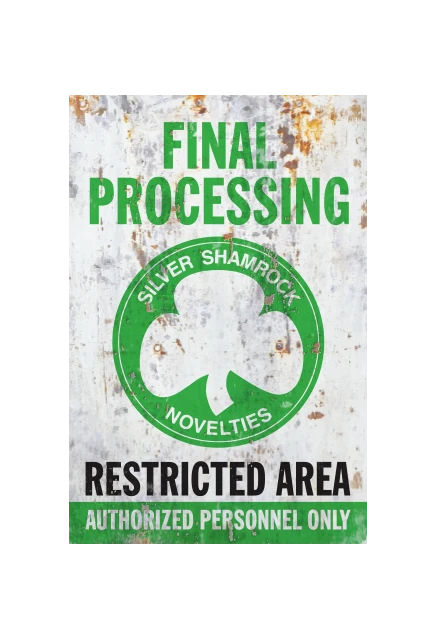This sign, designed by the masters at Trick or Treat Studios, was made to look like it came right from the Silver Shamrock factory wall.